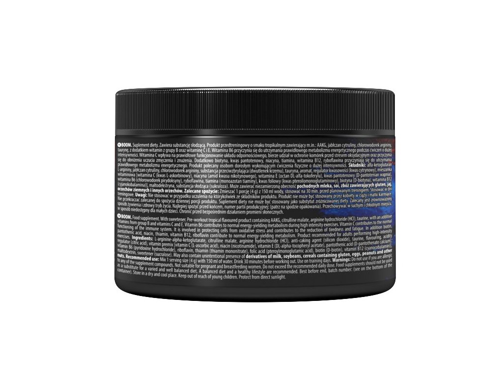 L-arginin alfa-ketoglutarát, citrulin malát, arginin hydrochlorid, oxid křemičitý, taurin, aroma, kyselina citronová, vitaminová směs (vitaminy C, B3, E, B5, B6, B2, B1, kyselina listová, biotin, B12), sladidlo sukralóza.