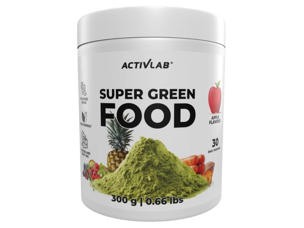 Activlab Super Green Food je komplexní doplněk stravy ve formě prášku, který kombinuje spirulinu, chlorellu, zeleninu, ovoce, extrakty bylin a široké spektrum vitamínů a minerálů. Neobsahuje cukr ani zbytečné přídatné látky a je vhodný pro vegetariány.