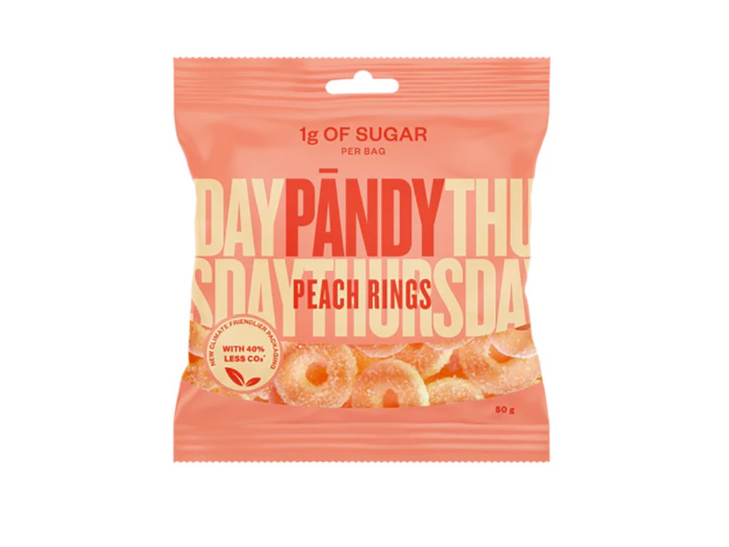 Broskev (Peach ring): Polydextróza, isomalto-oligosacharidy*, voda, želatina (hovězí), regulátor kyselosti (E296), barviva (černá mrkev, E160a, E150b), aromata, sladidlo (erythritol, acesulfam K, sukralóza), lazurovací prostředek (erythritol, E296, E903).