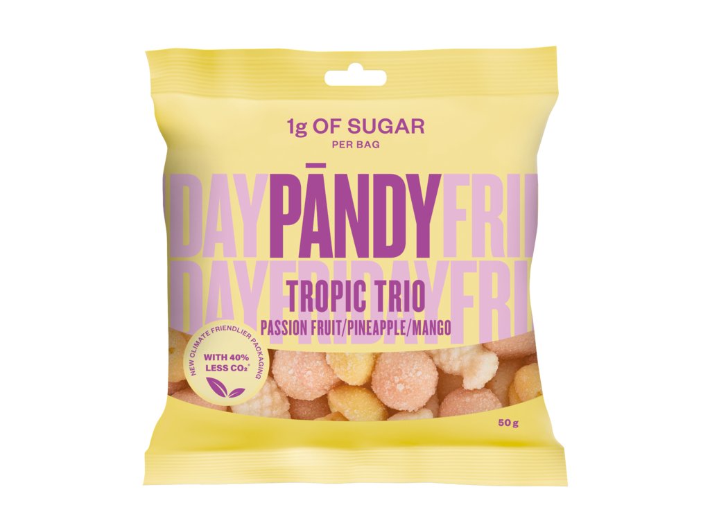 Tropické trio: Polydextróza (vláknina), isomalto-oligosacharidy*, voda, želatina (hovězí), regulátor kyselosti (E296), barviva (černá mrkev, oranžová mrkev), aromata, sladidla (erythritol, acesulfam-K, sukralóza), lazurovací prostředek(erythritol, E296, E903).