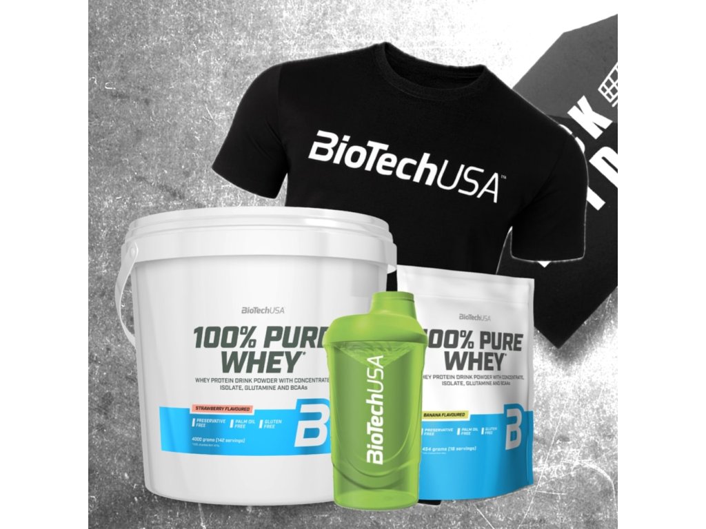 AKCE BioTech 100% Pure Whey 4000 g + ZDARMA 100% Pure Whey 454 g + Šejkr 600 ml + Triko