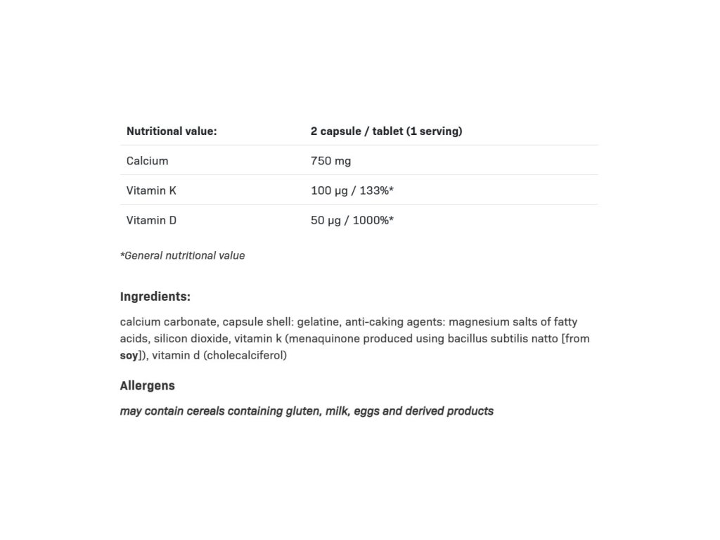 ALLNUTRITION CALCIUM D3 K2 je doplněk stravy určený pro fyzicky aktivní jedince, obsahující vápník, vitamín D a vitamín K. Vápník přispívá ke správné činnosti svalů. Vitamín D3 podporuje správné vstřebávání vápníku, pomáhá udržovat zdraví kostí a zubů a má pozitivní vliv na činnost svalů a imunitní systém.