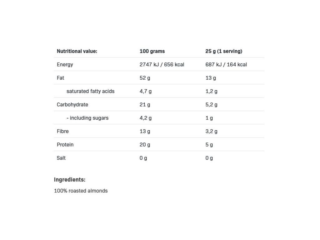 Náš mandlový krém je zcela bez přidaných látek. Na rozdíl od stabilizovaných pomazánek s obsahem hydrogenovaných tuků, neobsahuje transmastné kyseliny. ALLNUTRITION ALMOND CREAM neobsahuje přidanou sůl, palmový olej ani cukr – je tak čistou, poctivou volbou pro všechny, kteří chtějí svou stravu obohatit přirozeně.