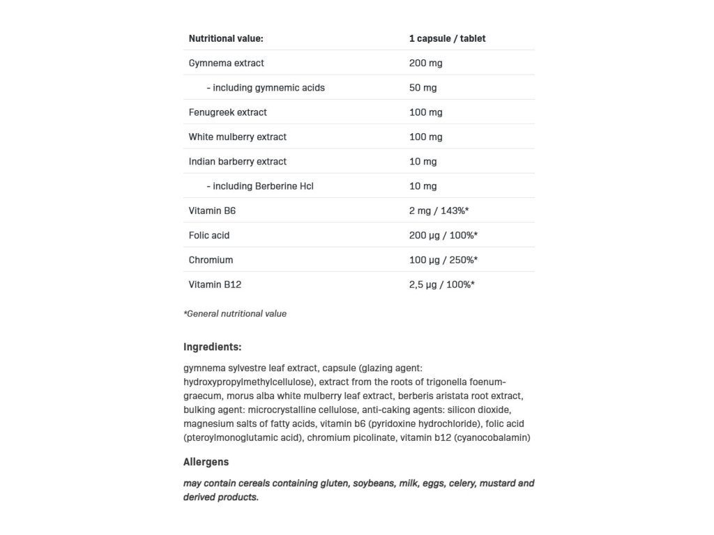 Doplněk stravy. Určeno pro osoby starší 18 let. Nepoužívejte, pokud jste alergičtí (přecitlivělí) na kteroukoli ze složek, nebo pokud užíváte léky (zejména antidiabetika nebo antikoagulancia). Osoby podstupující inzulínovou terapii nebo užívající perorální hypoglykemika by se měly před použitím poradit se svým lékařem. Nepoužívejte během těhotenství nebo kojení. Nepřekračujte doporučenou denní dávku. Doplněk stravy by neměl být používán jako náhrada pestré stravy. Pestrá a vyvážená strava a zdravý životní styl jsou důležité. Obal vždy po použití pečlivě uzavřete.Může obsahovat obiloviny obsahující lepek, sóju, mléko, vejce, celer, hořčici a jejich deriváty.
