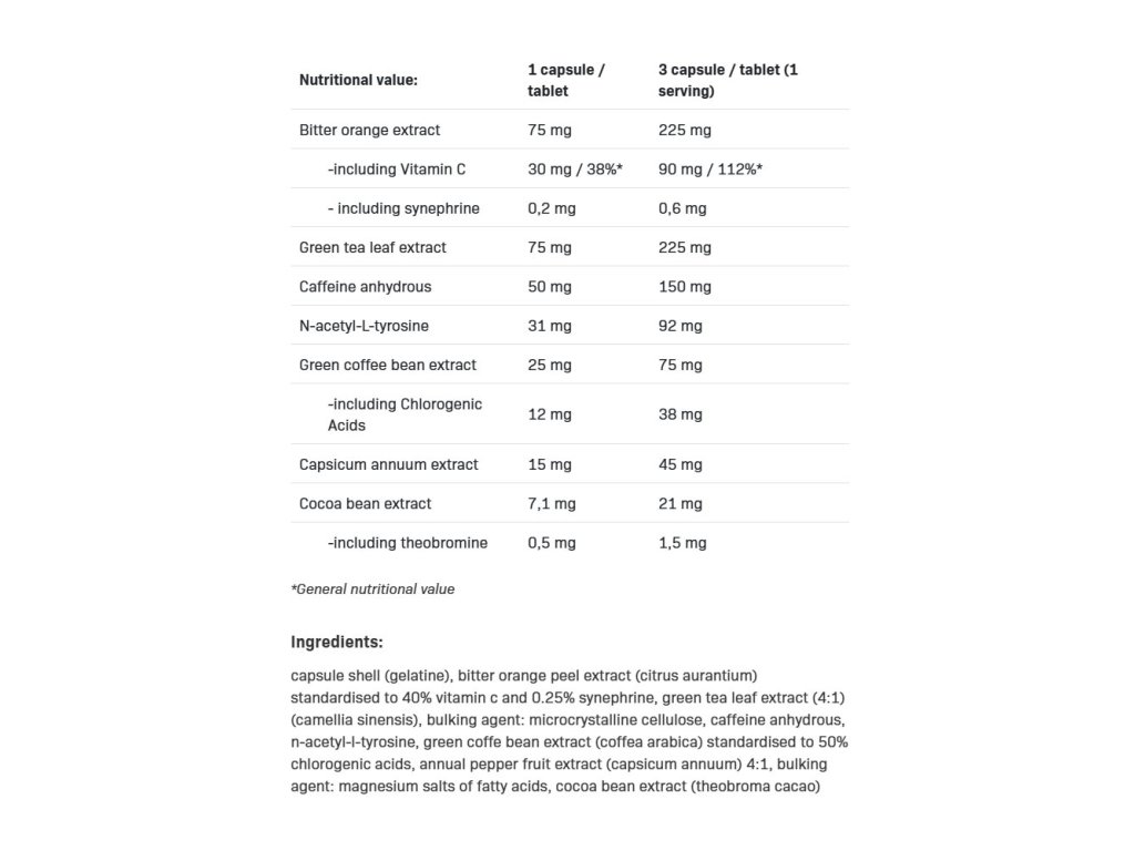 Extrakt z hořkého pomeranče se 40 % vitamínu C a 0,25 % synefrinu – synefrin v kombinaci s oktopaminem, kofeinem a polyfenoly ze zeleného čaje ovlivňuje proces lipolýzy. Podporuje uvolňování mastných kyselin z adipocytů a zvyšuje energetický výdej organismu, čímž zlepšuje spalování mastných kyselin v mitochondriích buněk.