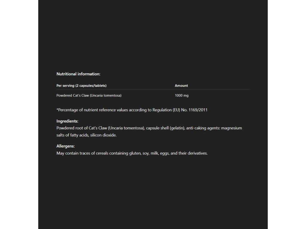 Tato rostlina, původem z amazonského deštného pralesa, má charakteristické háčkovité trny připomínající kočičí drápy. Práškovaný kořen se často používá jako složka doplňků stravy, které jsou oblíbené u osob hledajících přírodní podporu.Upozornění