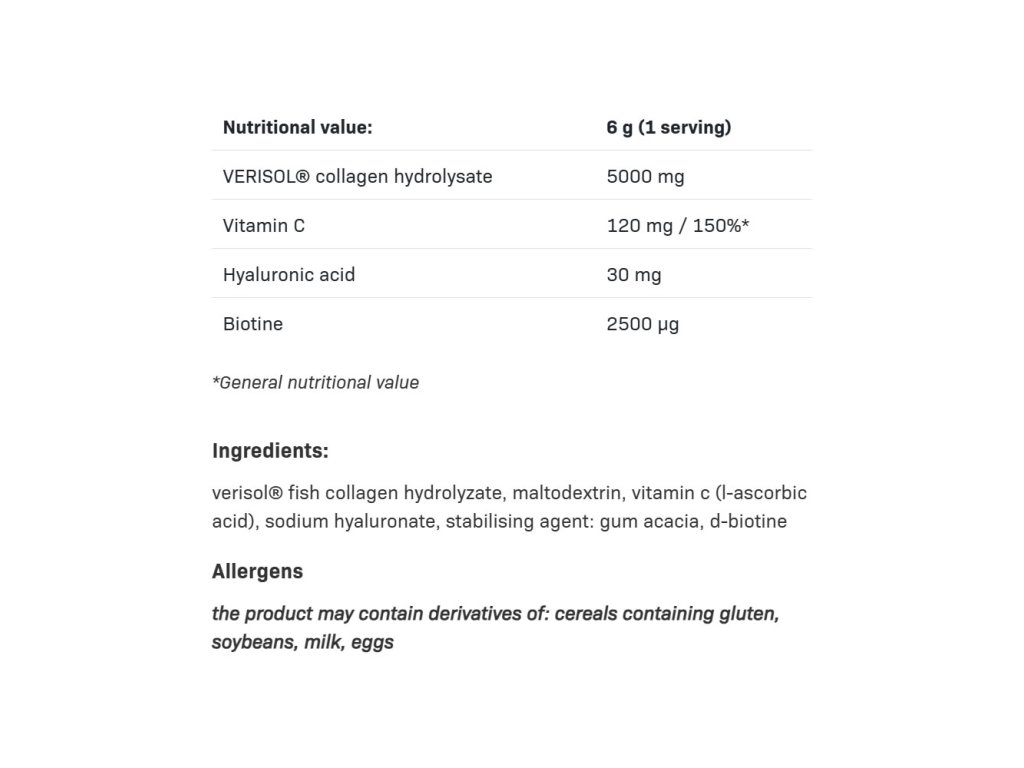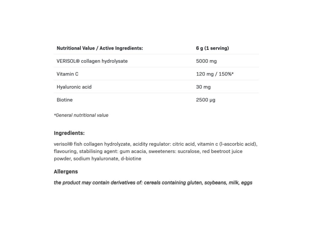 COLLAROSE FISH obsahuje patentovaný hydrolyzát mořského kolagenu – Verisol® – vyráběný německou farmaceutickou společností GELITA, který podporuje produkci kolagenu zevnitř.