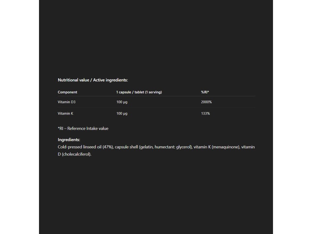 - Až 2000 % denní referenční hodnoty příjmu (NRV) vitamínu D3 a 133 % NRV vitamínu K