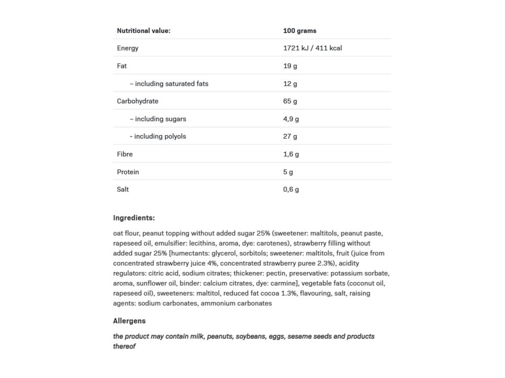 Obsahuje sladidlo. Obsahuje přirozeně se vyskytující cukry. Nekonzumujte v případě alergie. Nadměrná konzumace může mít projímavý účinek. Produkt může obsahovat mléko, ořechy, sóju, vejce, sezam a jejich deriváty.Dávkování