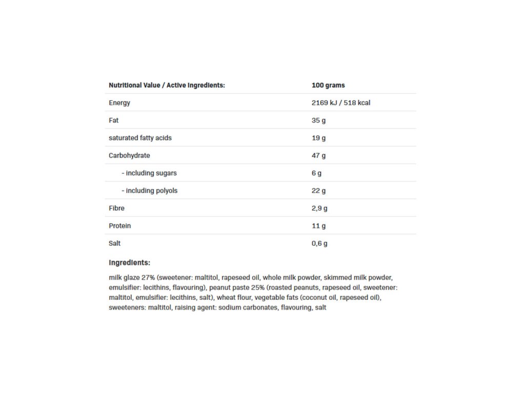 Obsahuje sladidlo. Obsahuje přirozeně se vyskytující cukry. Nekonzumujte v případě alergie. Nadměrná konzumace může mít projímavý účinek. Může obsahovat stopy ořechů, sezamu, mléka a mléčných výrobků.Dávkování