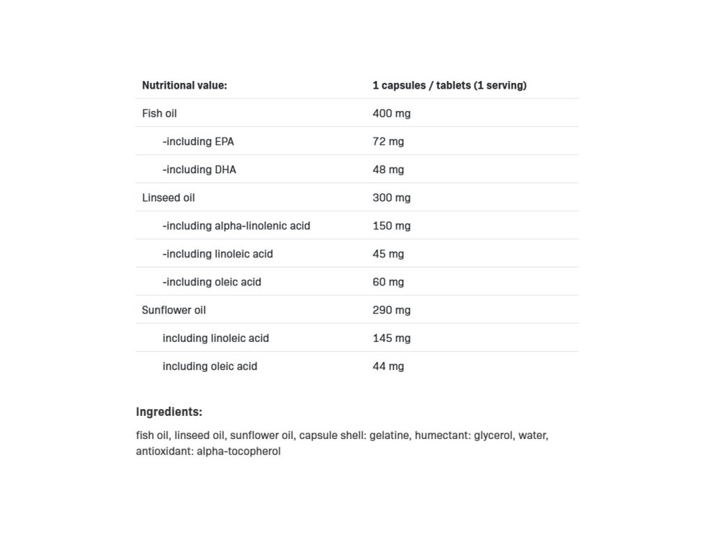 Produkt obsahuje minimálně 400 mg rybího oleje a 300 mg lněného oleje. Kromě toho obsahuje 290 mg slunečnicového oleje, což z něj činí vynikající zdroj nenasycených mastných kyselin!