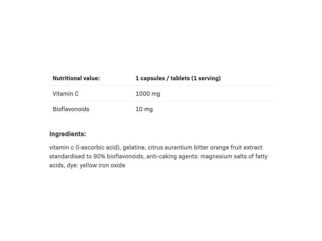 Tento produkt je určen především pro fyzicky aktivní jedince a nenahrazuje vyváženou stravu. Nepřekračujte doporučenou denní dávku. Uchovávejte mimo dosah dětí. Složení: Vitamin C (L-askorbová kyselina), želatina, protispékavá látka – hořečnaté soli mastných kyselin, extrakt z hořkého pomeranče (Citrus aurantium) standardizovaný na 90 % bioflavonoidů, barvivo – oxid titaničitý.Dávkování