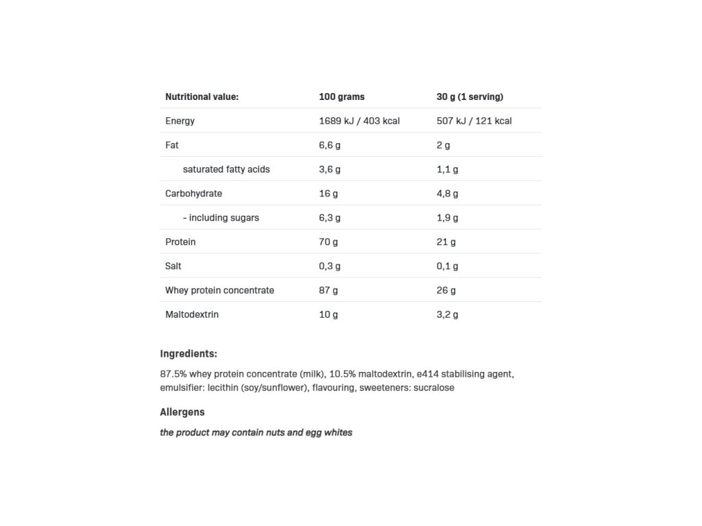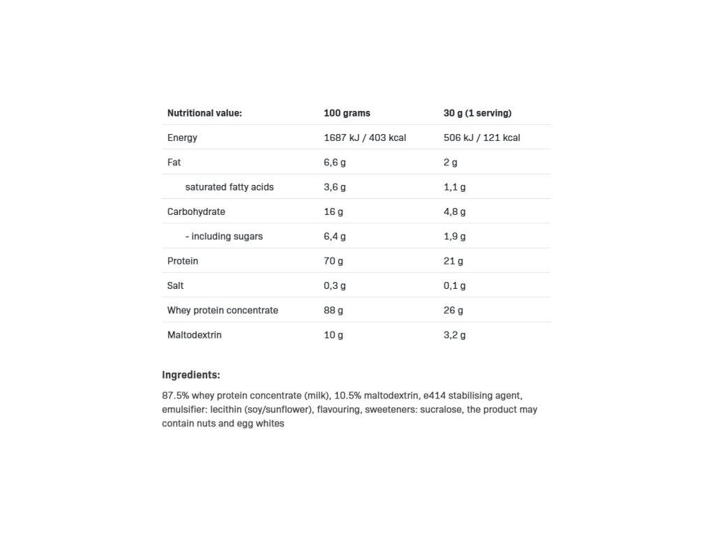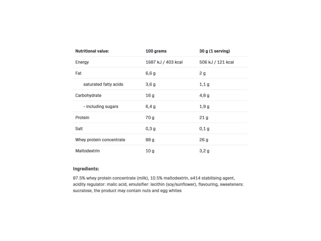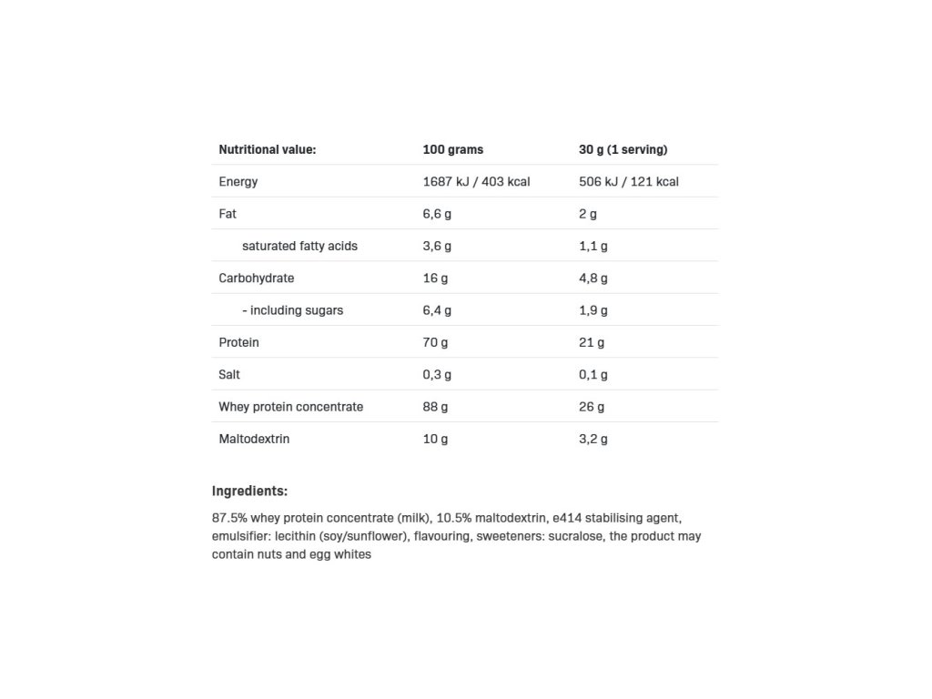 WHEY PROTEIN lze užívat kdykoli během dne, v jakékoli formě – lze jej rychle a snadno připravit jako shake s vodou nebo mlékem. Skvěle se hodí také jako přísada do ovesné kaše, míchaných vajec nebo jídel.Při pečení vám proteinový doplněk umožní nahradit část kaloricky vydatné mouky a zároveň zajistit správný přísun bílkovin v jídle.