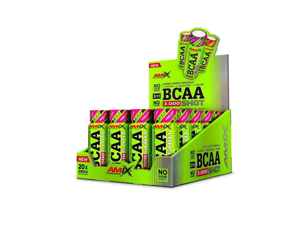 BCAA 3000 SHOT je doplněk stravy v tekuté formě v kapesním balení s obsahem esenciálních aminokyselin s rozvětveným řetězcem BCAA v poměru 2:1:1.