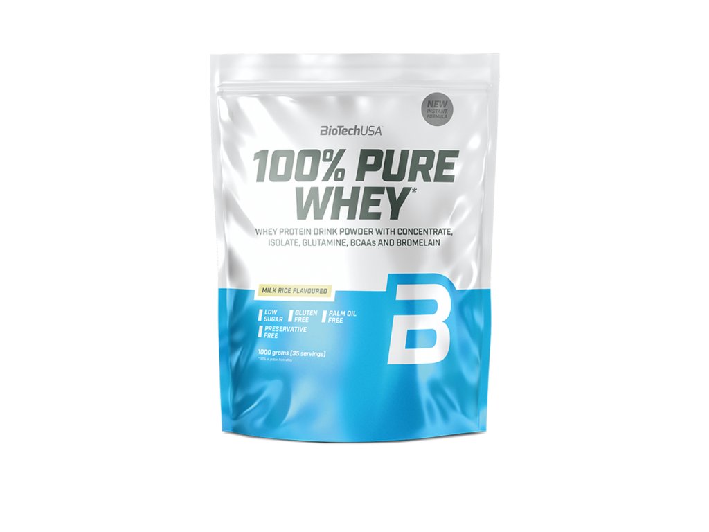 100% Pure Whey je vysoce kvalitní proteinový prášek s vysokou biologickou hodnotou. Je kombinací syrovátkového koncentrátu, syrovátkového izolátu a přidaných aminokyselin (L-glutamin, L-arginin a BCAA). Díky nízkému obsahu sacharidů a tuků je vhodný i v dietní fázi. Neobsahuje lepek ani palmový olej. K dostání je v pestré škále příchutí.Přednosti: