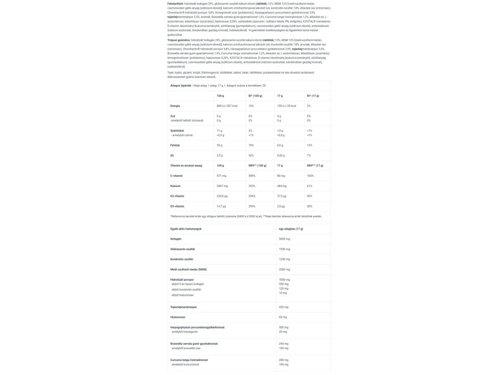 - Obsahuje různé typy kolagenu, například hydrolyzovaný kolagen typu II z prášku z hydrolyzované chrupavky ChondrActiv®.