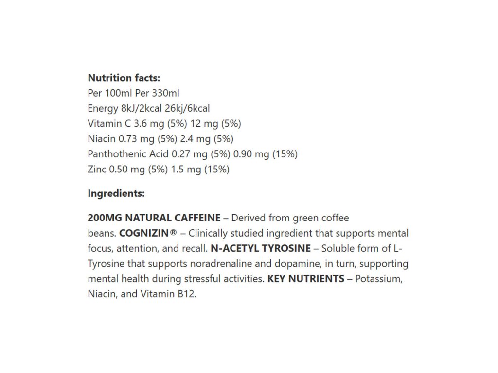 Není určeno pro děti a neměly by jej konzumovat těhotné nebo kojící ženy. Obsahuje 200 mg přírodního kofeinu v jedné plechovce, vyhněte se dalším zdrojům kofeinu, abyste zůstali pod ~400 mg/den. Pokud jste citliví na kofein, máte srdeční potíže nebo užíváte léky, poraďte se před užitím s lékařem.Dávkování