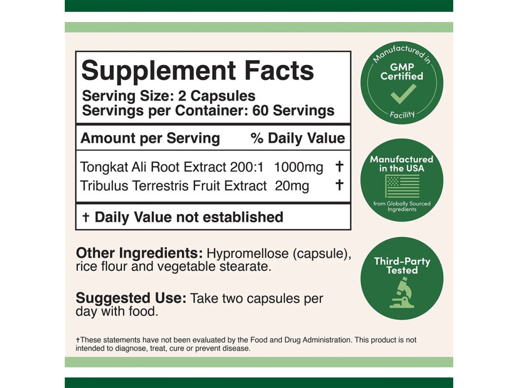 - DVOUměsíční zásoba: Náš komplex Tongkat Ali / Tribulus má 60 porcí (120 kapslí). Dostatečné množství na celé dva měsíce