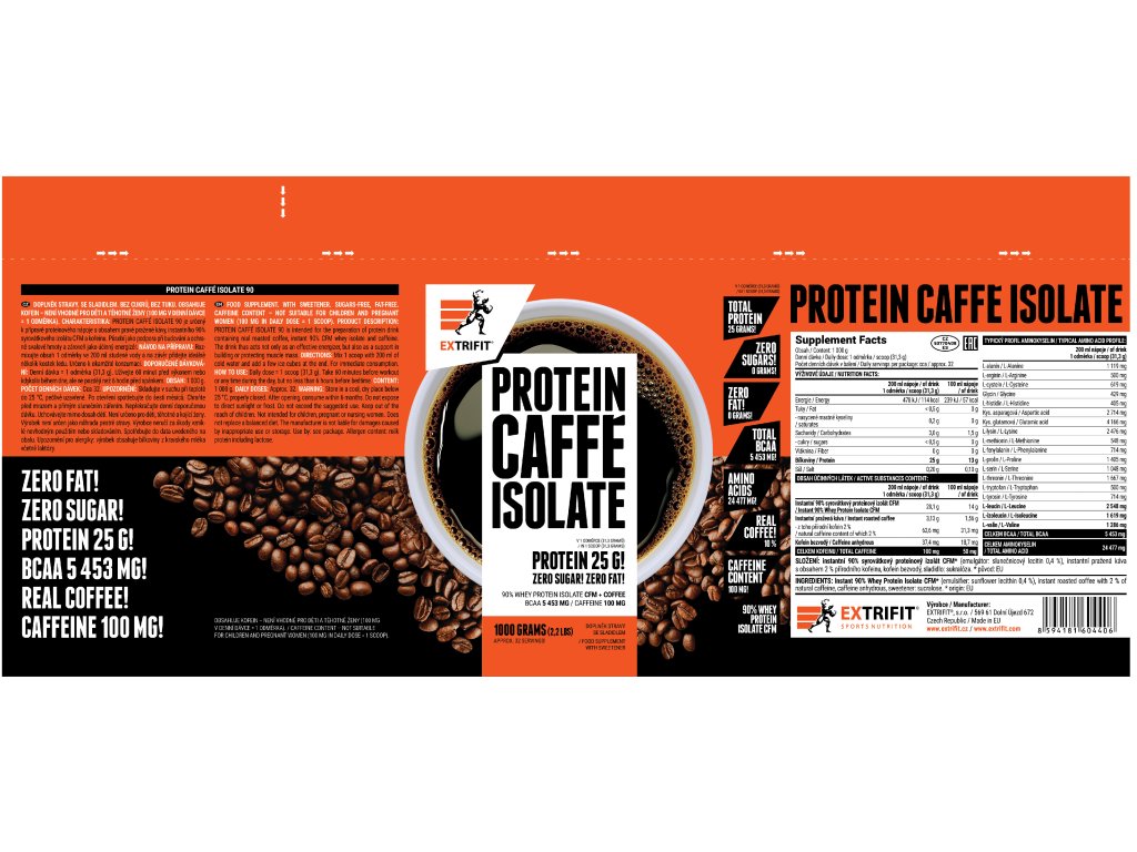 Jako proteinovou složku Protein Caffé Isolate 90 v Extrifitu zvolili mimořádně kvalitní 90% syrovátkový izolát CFM s velmi vysokým obsahem BCAA a špičkovou stravitelností. Zvlášť pečlivě se věnovali výběru kvalitní instantní kávy s obsahem 2 % přírodního kofeinu a lahodnou chutí. Káva je zastoupena v produktu Protein Caffé Isolate 90 ve velmi vysokém množství, a to 10 %.