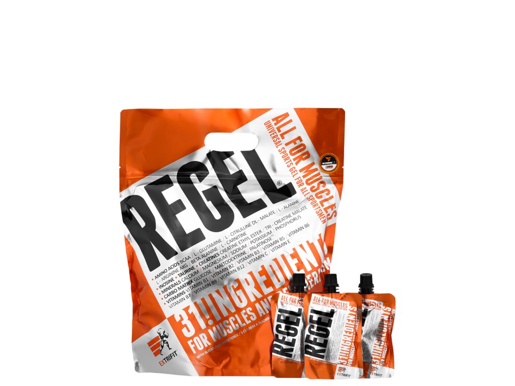 Lámali jste si někdy hlavu nad tím, jaké všechny látky a v jakém množství máte dávkovat pro urychlení regenerace po tréninku? Jaké přijímat sacharidy, jak dávkovat aminokyseliny nebo kolik užívat glutaminu a kreatinu pro odvrácení katabolismu po tréninku? Firma Extrifit vyslyšela tyto Vaše časté dotazy! Regel je dokonale sestaveným komplexem všech látek, které sportovec nutně potřebuje doplnit v průběhu a po skončení tréninku! Regel obsahuje pečlivě vyvážený poměr tří druhů sacharidů a volných aminokyselin, anabolizéry, dvě formy kreatinu a komplex vitamínů a minerálních látek. A to vše ve formě hotového gelu připraveného k okamžité konzumaci.