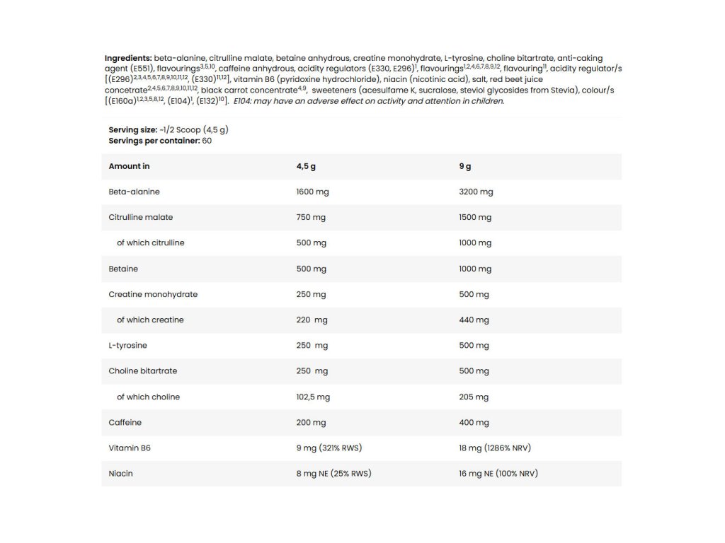 Nepoužívejte, pokud jste alergičtí na některou ze složek produktu. Nepřekračujte doporučenou denní dávku. Nepřekračujte dávku 400 mg kofeinu denně ze všech zdrojů. Doplňky stravy by neměly být používány jako náhrada pestré a vyvážené stravy. Doporučuje se pestrá a vyvážená strava a zdravý životní styl. Nepoužívejte, pokud jste těhotná nebo kojíte. Uchovávejte mimo dosah malých dětí. Nekonzumujte s alkoholem. Pokud užíváte léky, měli byste se před užitím přípravku poradit se svým lékařem. Odměrka přiložená v balení slouží k usnadnění dávkování, ale nezaručuje přesné odměření dávky. Pro přesné odměření doporučujeme použít váhu. Před použitím balení dobře protřepejte. Tento produkt je prodáván na váhu, nikoli podle objemu. Během přepravy a manipulace může dojít k usazení prášku, což může ovlivnit hustotu prášku. Tento produkt obsahuje stanovený počet porcí, pokud je dávka přesně odměřena podle váhy.Dávkování
