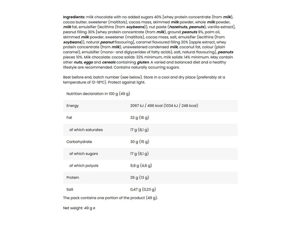 Proteinová tyčinka v mléčné čokoládě bez přidaného cukru s arašídovou náplní a náplní s karamelovou příchutí a arašídy. Slazeno sladidlem.Složení: mléčná čokoláda bez přidaného cukru 40 % [syrovátkový proteinový koncentrát (z mléka), kakaové máslo, sladidlo (maltitoly), kakaová hmota, odstředěné sušené mléko, plnotučné sušené mléko, mléčný tuk, emulgátor (lecitiny (ze sóji)), ořechová pasta (lískové ořechy, arašídy), vanilkový extrakt], arašídová náplň 30 % [syrovátkový proteinový koncentrát (z mléka), mleté arašídy 9 %, palmový olej, odstředěné sušené mléko, sladidlo (maltitoly), kakaová hmota, sůl, emulgátor (lecitiny (ze sóji)), přírodní aroma arašídů], náplň s karamelovou příchutí 20 % [jablečný extrakt, syrovátkový proteinový koncentrát (z mléka), neslazené kondenzované mléko, kokosový tuk, barvivo (prostý karamel), emulgátor (mono- a diglyceridy mastných kyselin), sůl, přírodní aroma], kousky arašídů 10 %. Mléčná čokoláda: kakaové sušiny: min. 32 %, mléčné sušiny: min. 14 %. Může obsahovat jiné ořechy, vejce a obiloviny obsahující lepek. Doporučuje se pestrá a vyvážená strava a zdravý životní styl. Obsahuje přirozeně se vyskytující cukry.