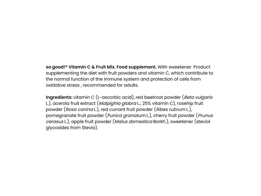 Doplněk stravy. Se sladidlem. Produkt doplňuje stravu o ovocné prášky a vitamin C, které přispívají k normální funkci imunitního systému a ochraně buněk před oxidačním stresem, doporučeno pro dospělé.Upozornění