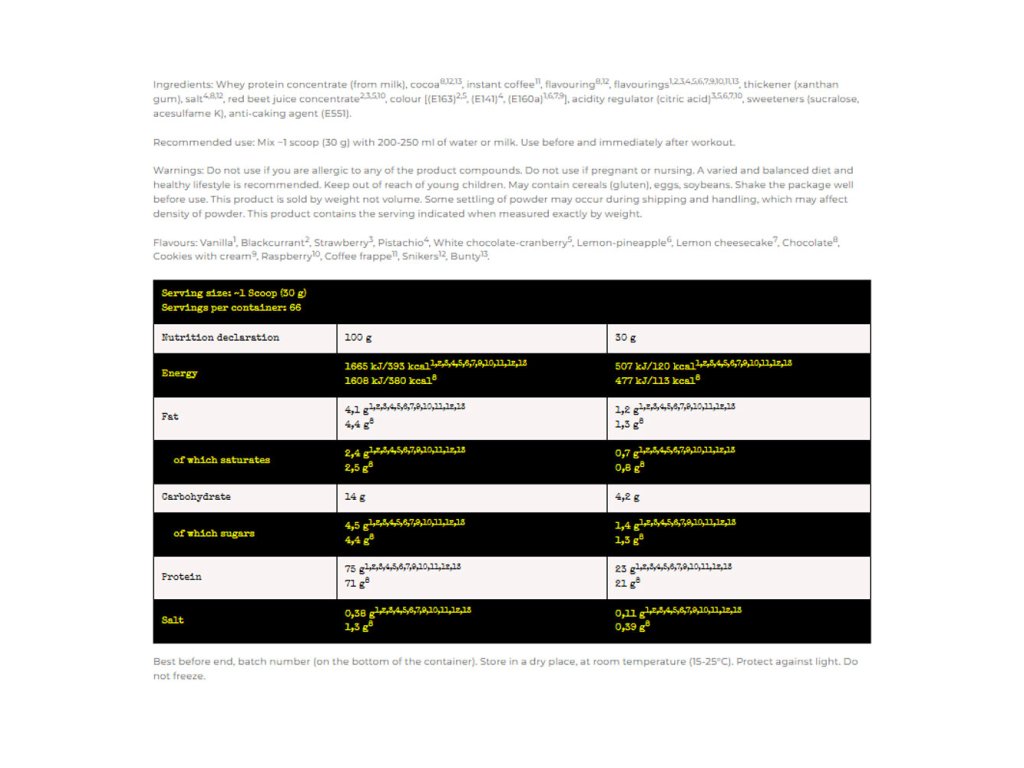 Nepoužívejte, pokud jste alergičtí na některou ze složek přípravku. Nepoužívejte, pokud jste těhotná nebo kojíte. Doporučuje se pestrá a vyvážená strava a zdravý životní styl. Uchovávejte mimo dosah malých dětí. Může obsahovat obiloviny (lepek), vejce, sóju. Před použitím balení dobře protřepejte. Tento výrobek se prodává podle hmotnosti, nikoli podle objemu. Během přepravy a manipulace může dojít k určitému usazování prášku, což může ovlivnit hustotu prášku. Tento výrobek obsahuje uvedenou porci při přesném měření hmotnosti.Dávkování