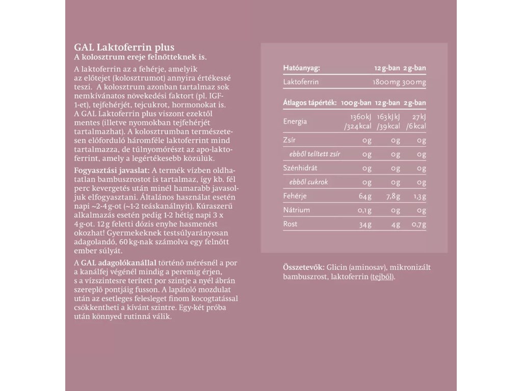 Laktoferin je bílkovina, díky níž je kolostrum tak cenné. Kolostrum však obsahuje také mnoho nežádoucích růstových faktorů (např. IGF-1), mléčné bílkoviny, laktóza a hormony. GAL Lactoferrin plus je bez nich (a může obsahovat stopy mléčné bílkoviny). Obsahuje všechny tři typy laktoferinu, které se přirozeně vyskytují v kolostru, ale převážně apo-laktoferin, který je z nich nejcennější. Tento produkt byl vyvinut ve spolupráci s profesionálním týmem společnosti Nutrition Adjustment™.
