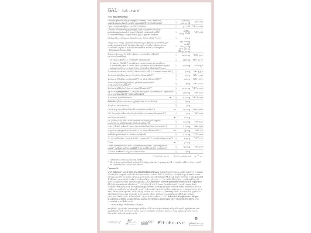 Naše dětská výživa GAL+ byla vyvinuta na základě nejnovějších výzkumů, s ohledem na přirozenost a vitalitu, aby poskytovala všechny vitamíny, minerály a stopové prvky v ideální formě, množství a poměru, které se neliší od toho, jak by byly získávány prostřednictvím stálé stravy plné živin a rozmanitosti. Tam, kde je to prospěšné, jsou vitamíny a minerály částečně získávány z ekologicky pěstovaných (organických) extraktů bylin a koření. Z hlediska množství bylo vždy důležité zajistit, aby denní příjem obsahoval dávku, která je považována za účinnou, ale v žádném případě nepřekračoval množství, které je považováno za zdravé, tj. částku, kterou nelze pokrýt žádnými dietními prostředky. Kromě toho je důležité, aby plynulému vývoji nového života nebránilo nic, co není vhodné. V našem výrobku po tom není ani stopy.