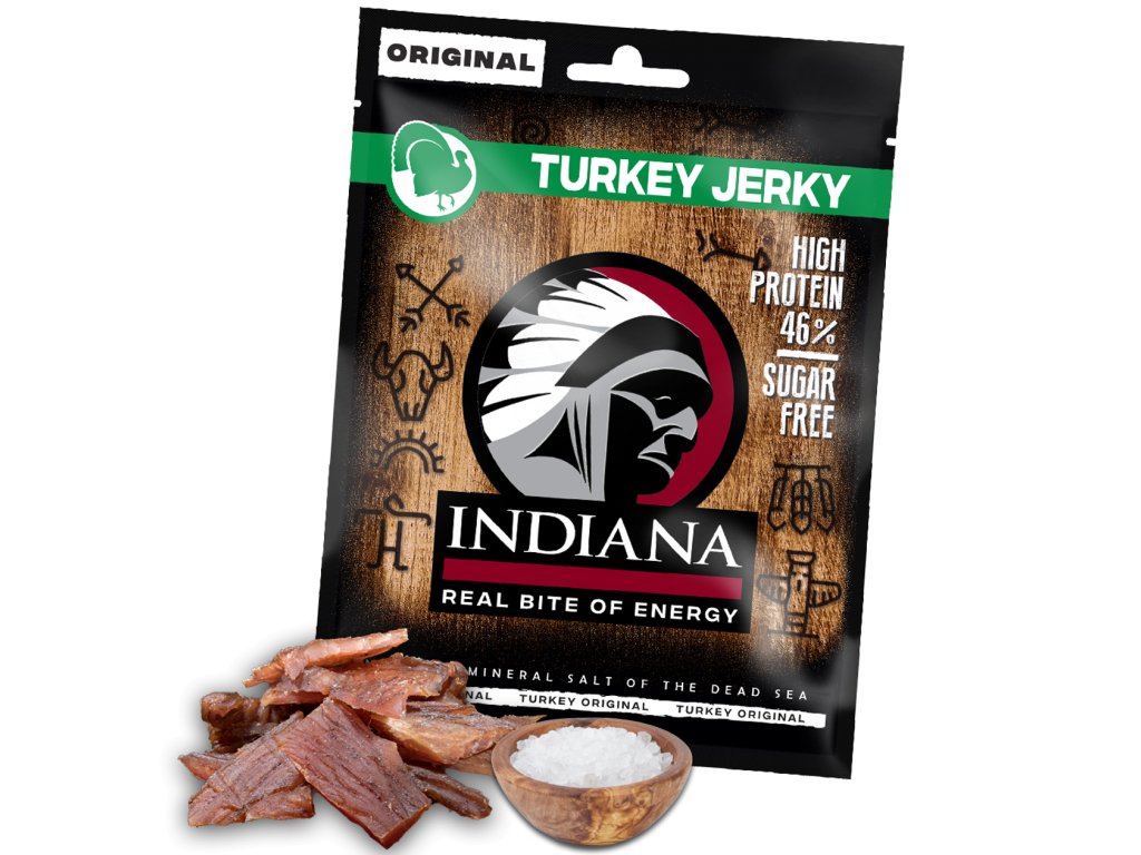 Jerky obecně označuje syrové maso, ze kterého je odstraněn tuk a následně je nakrájeno a vysušeno. Indiana Jerky jako takové pak náš náčelník vyrábí podle starých indiánských receptur. Indiana Jerky jsou tence nakrájené plátky libového masa, dále marinované, sušené a zauzené. Sušení probíhá několik hodin tak, aby si výchozí surovina zachovala jak přirozenou chuť masa, tak svou šťavnatost a pružnost. Pro sportovce nebo zdatného výletníka není zdravější, rychlejší a výživnější svačinky než sáček Indiana Jerky. Je to lehká, na dotek nemastná pochoutka, která obsahuje až 73 % proteinů a jen minimum tuku. Pro výrobu byl zvolen závod, jež splňuje nejpřísnější hygienické normy. Zde je Jerky vyráběno na strojích v majetku firmy Indiana s.r.o..Přednosti: