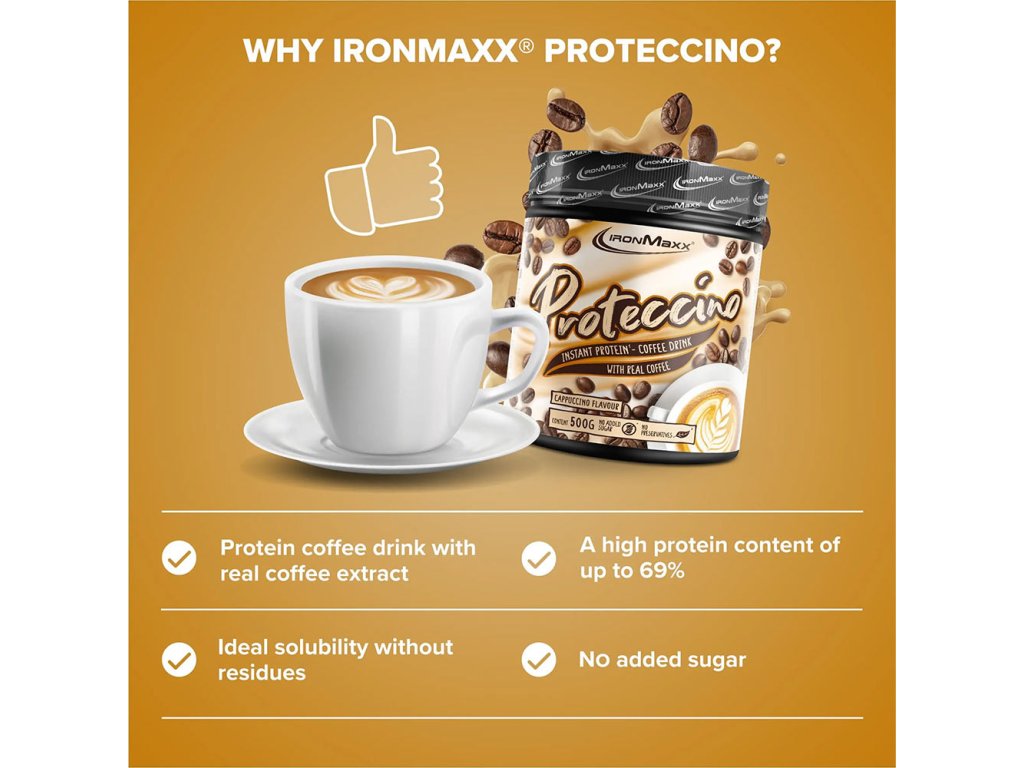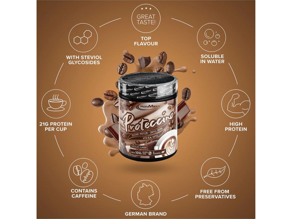 Díky působivému obsahu bílkovin až 69 % je naše káva Proteccino skutečnou kávou s vysokým obsahem bílkovin. A co je na ní nejlepší? Díky obsahu přírodního cukru tato proteinová káva neobsahuje žádný přidaný cukr. Svému tělu tak můžete dodat cenné bílkoviny, aniž byste se museli vzdát nepřekonatelné chuti kávy. IronMaxx® Proteccino poskytuje nejen vysoce kvalitní bílkoviny, ale také extra dávku kofeinu. S 80 mg kofeinu na 30 g porci a širokým aminokyselinovým profilem, který zahrnuje všechny 3 BCAA, 5 dalších esenciálních aminokyselin a 10 neesenciálních aminokyselin, poskytuje tato proteinová káva optimální podporu vašich fitness cílů. A to vše bez konzervačních látek!Hvězda mezi proteinovými nápoji