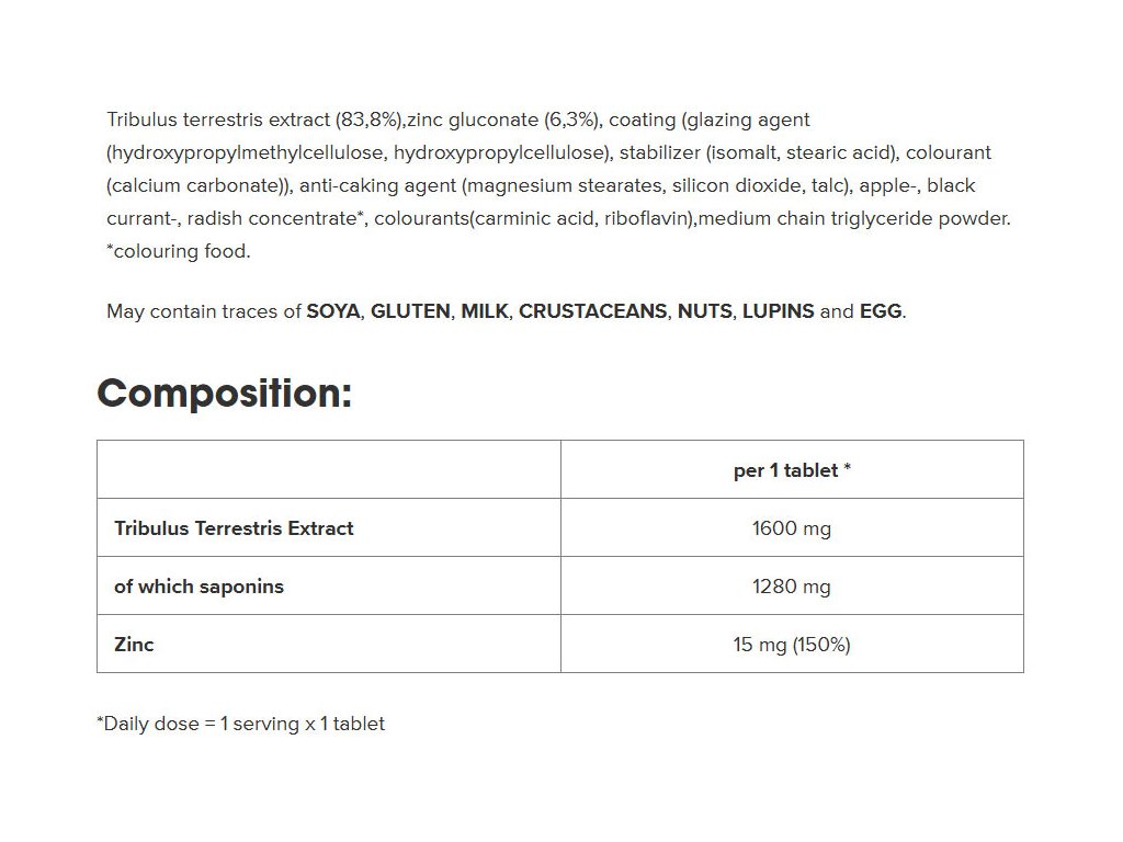 Jedna tableta TT® Ultra Strong od IronMaxx® obsahuje 1600 mg extraktu Tribulus Terrestris, z toho 1280 mg saponinů. Saponiny jsou v rostlině Tribulus Terrestris přirozeně hojné. Tablety s extraktem Tribulus Terrestris často obsahují zinek, protože zinek přispívá k udržení normální hladiny testosteronu v krvi z denního příjmu 10 mg. Tablety TT® Ultra Strong od společnosti IronMaxx® obsahují 15 mg zinku. To znamená, že jedna tableta tohoto doplňku denně pokryje doporučenou denní dávku. Zinek je pro lidský organismus nesmírně důležitý. Mimo jiné přispívá k normálním kognitivním funkcím, normálnímu metabolismu mastných kyselin a udržení normálních kostí.Upozornění