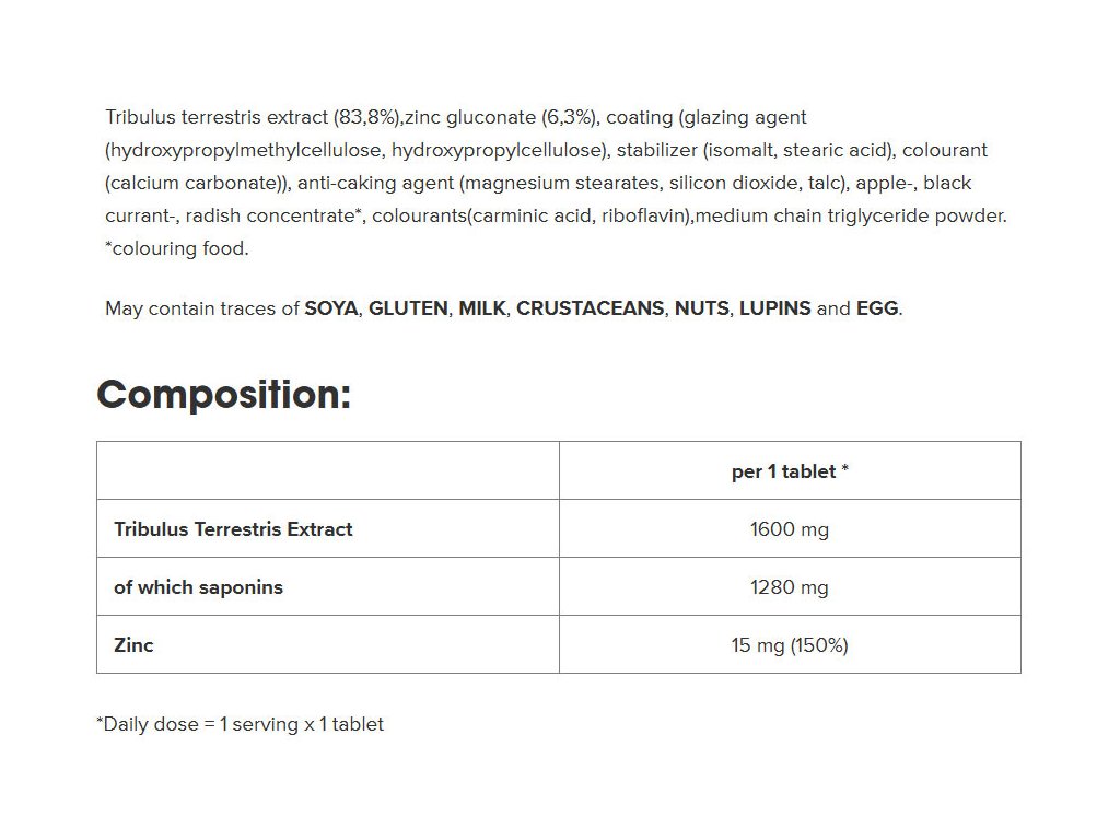 - Vysoce dávkovaný extrakt Tribulus Terrestris 1600 mg v jedné tabletě