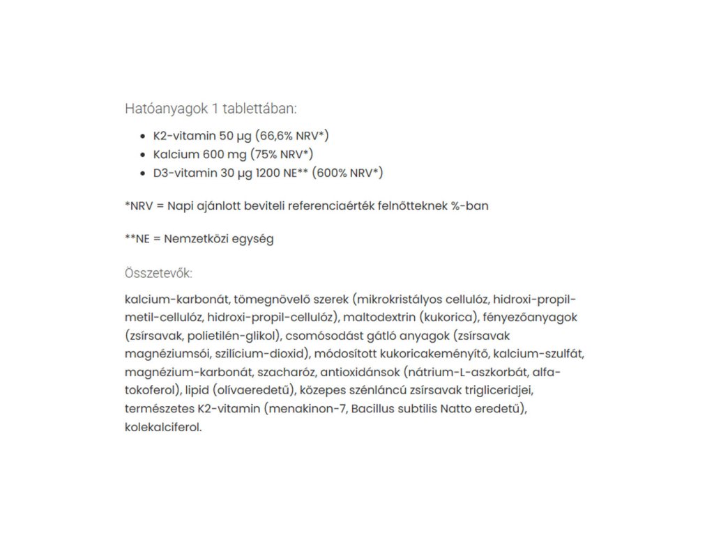 Vápník je nezbytný pro udržení normálních kostí a zubů. Přispívá k normální činnosti svalů a normální funkci trávicích enzymů. Hraje roli v normálním energetickém metabolismu a normálním přenosu nervových vzruchů. Vápník se také podílí na dělení a specializaci buněk.Vitamin D přispívá k normální absorpci/využití vápníku a fosforu, udržení normální hladiny vápníku v krvi, zdravých kostí, normální funkci svalů a zubů. Podporuje také normální funkci imunitního systému a hraje roli v procesu dělení buněk.
