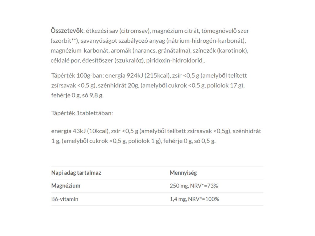Hořčík a vitamin B6 přispívají ke správnému fungování nervového systému a k udržení normálních psychických funkcí. Hořčík a vitamin B6 přispívají ke snížení únavy a vyčerpání. Hořčík přispívá k udržení normálního stavu kostí a zubů. Vitamin B6 přispívá k normální tvorbě červených krvinek. Vitamin B6 přispívá k regulaci hormonální aktivity.Upozornění