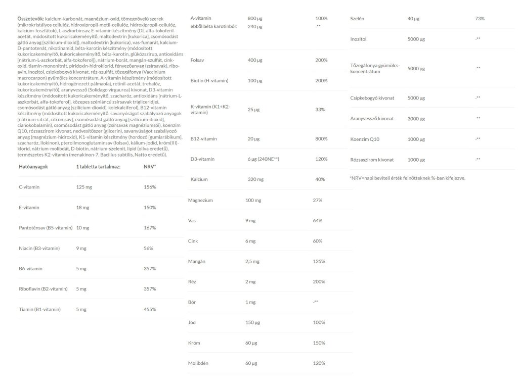 Měď, zinek, vitaminy B6, B12, C a D3, selen a železo přispívají k normální funkci imunitního systému. Mangan, zinek, vitaminy B2, E a C přispívají k ochraně buněk před oxidačním stresem. Vápník je nezbytný pro udržení normálního stavu kostí. Hořčík přispívá k normální funkci svalů a správnému fungování nervového systému. Kyselina listová, železo, vitaminy B3, B6 a B12 přispívají ke snížení únavy a vyčerpání. Biotin a zinek přispívají k udržení normálního stavu vlasů a pokožky. Vitamin D přispívá k udržení zdravých kostí. Zlatobýl přispívá ke zdraví močových cest.
