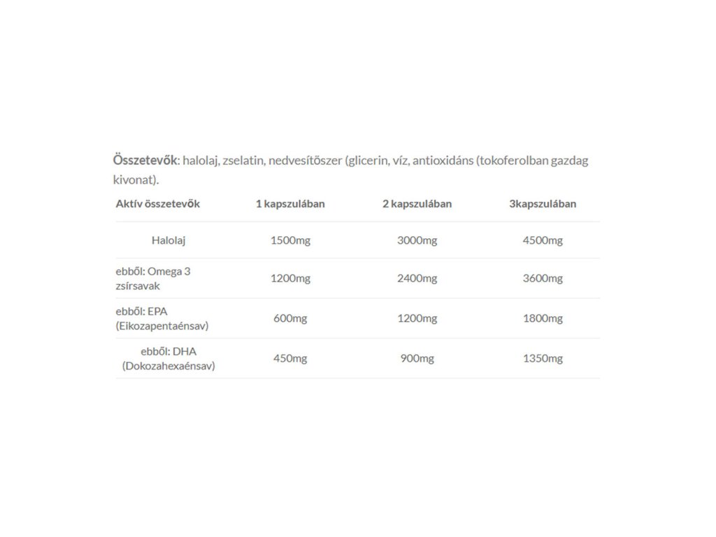 Rybí olej ve výrobku obsahuje omega-3 mastné kyseliny v jejich přírodní (TG) formě. Kyselina eikosapentaenová (EPA) a kyselina dokosahexaenová (DHA) přispívají k udržení normálního krevního tlaku. Příznivých účinků lze dosáhnout při denním příjmu 3 g EPA a DHA, což lze zajistit 3 kapslemi tohoto produktu. EPA a DHA přispívají ke správné funkci srdce. Příznivého účinku lze dosáhnout při denním příjmu 250 mg EPA a DHA, kterého lze dosáhnout užitím 1 kapsle tohoto přípravku. DHA přispívá k udržení normální funkce mozku a normálního vidění. Příznivého účinku se dosáhne při užívání 250 mg DHA denně, což lze zajistit užíváním 1 kapsle tohoto přípravku. EPA a DHA pomáhají udržovat normální hladinu triglyceridů v krvi. Příznivého účinku lze dosáhnout při denním příjmu 2 g EPA a DHA, což lze zajistit 2 kapslemi tohoto produktu. Kombinované denní množství EPA a DHA užívané jako doplněk stravy by nemělo překročit 5 g.