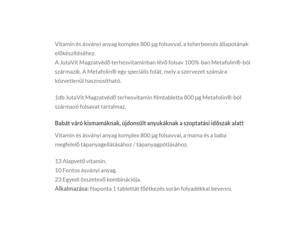 1 těhotenská potahovaná tableta JutaVit Fetal Protection obsahuje 800 μg kyseliny listové pocházející z Metafolinu®.