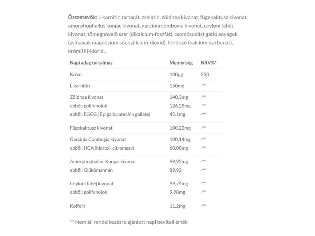 JuvaPharma Kft. vyvinula produkt obsahující komplexní kombinaci 7 účinných látek se speciálním složením jako doplněk na hubnutí pro zákazníky, kteří chtějí zhubnout. Výrobek doporučujeme jak sportovním nadšencům, tak zákazníkům, kteří vedou sedavý způsob života. Extrakt z opuncie podporuje metabolismus tuků, což může pomoci při kontrole hmotnosti. Chrom se podílí na normálním metabolismu makroživin.