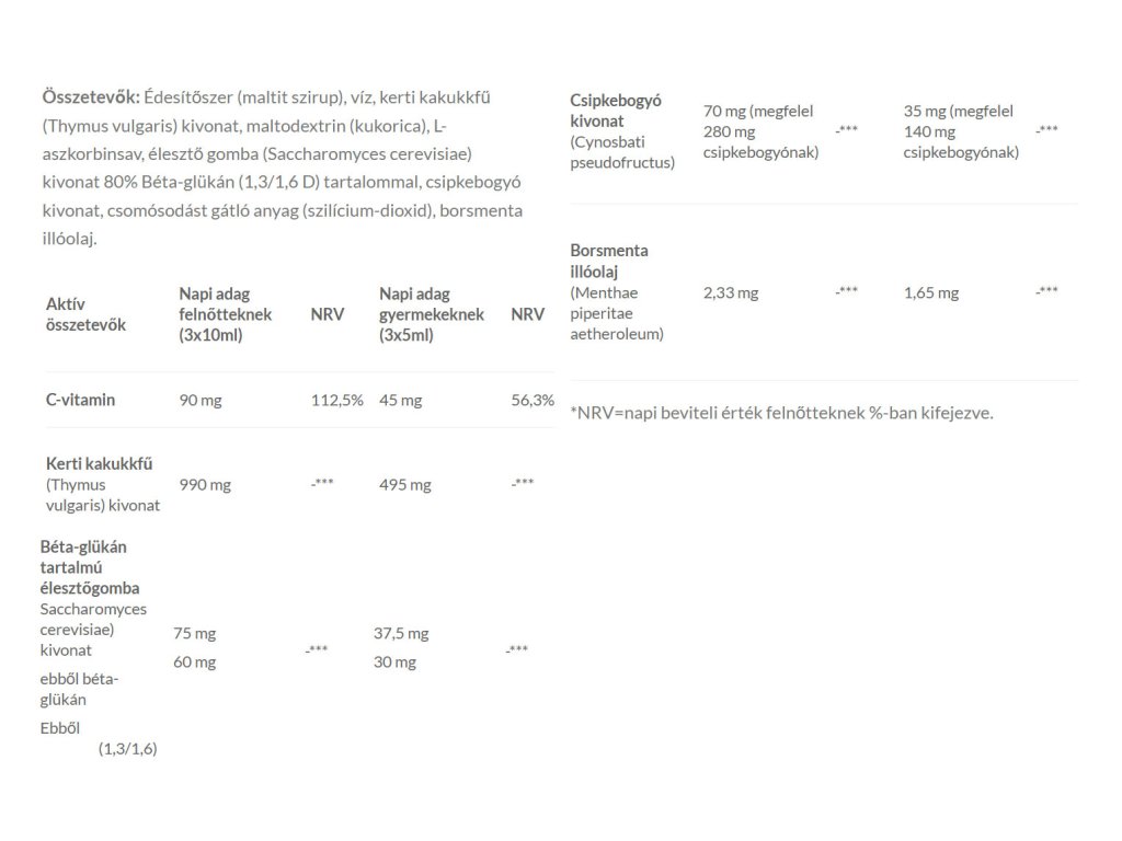 Tekutý doplněk stravy obsahující extrakt z tymiánu, extrakt ze šípku, beta-glukan, vitamin C a esenciální olej z máty peprné se sladidlem. Výtažek z tymiánu může zklidnit krk, hltan a hlasivky a podpořit normální funkci imunitního systému. Vitamin C přispívá k normální funkci imunitního systému.