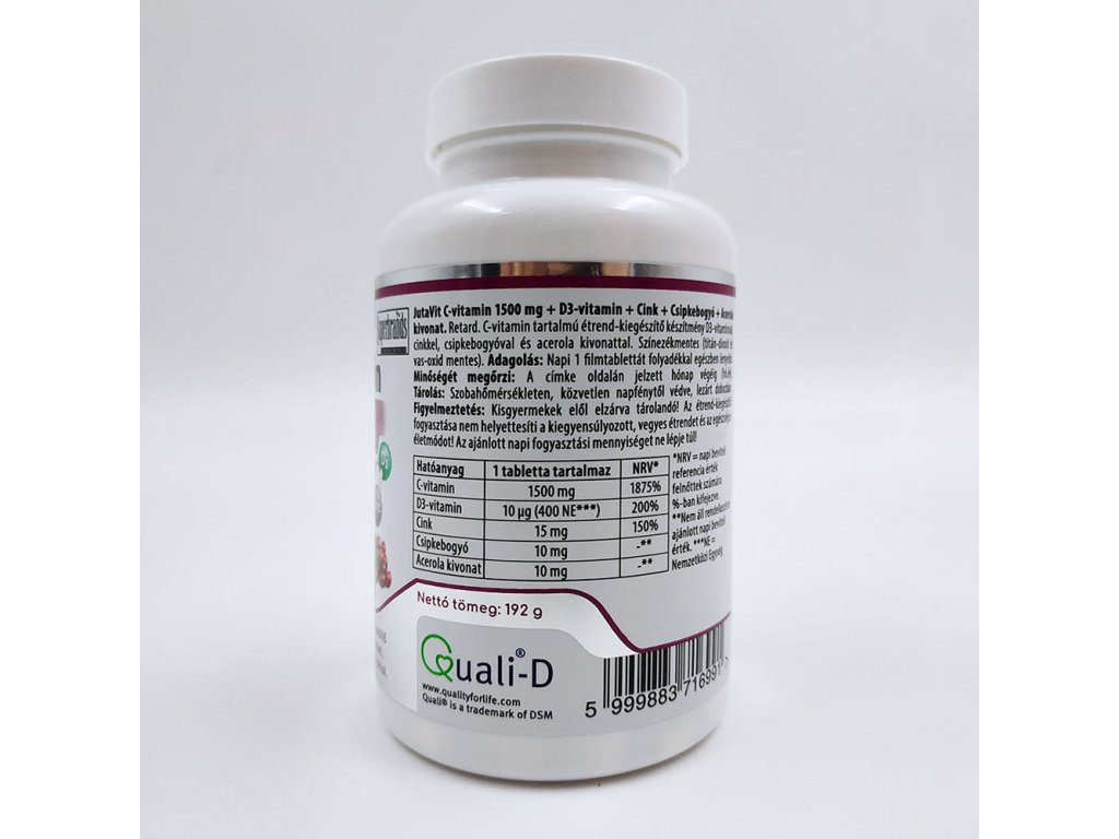 JutaVit Vitamin C 1500 mg + D3 + zinek obsahuje 1500 mg vitaminu C s prodlouženým uvolňováním s vitaminem D3, zinkem, acerolou a šípkovým extraktem, který postupně dodává vitaminu C do našeho těla. Vitamin C, vitamin D3 a zinek přispívají k normální funkci imunitního systému. Vitamin C také přispívá ke snížení míry únavy a vyčerpání, k ochraně buněk před oxidativním stresem, k udržení normálních psychických funkcí a k normálnímu fungování nervového systému. Zlepšuje vstřebávání železa a přispívá ke správné tvorbě kolagenu a tím k udržení normálního stavu cév, kůže, zubů, dásní, chrupavek a kostí. Vitamin D3 přispívá k normálnímu vstřebávání/využívání vápníku a fosforu, udržuje hladinu vápníku v krvi, udržuje zdravé kosti, funkci svalů, normální stav zubů a hraje roli při dělení buněk.