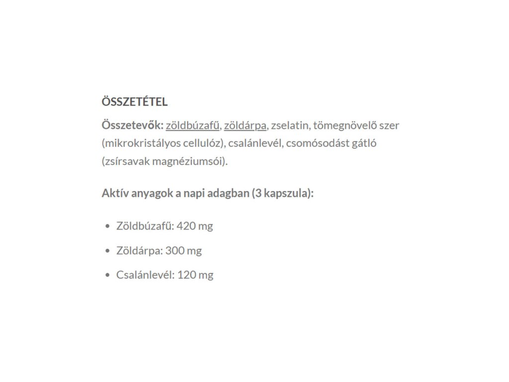 Doplněk stravy obsahující zelenou pšenici, zelený ječmen a kopřivu. Denní dávka obsahuje 420 mg zelené pšenice, 300 mg zeleného ječmene a 120 mg listů kopřivy.Upozornění