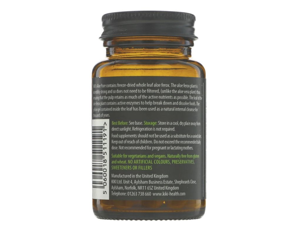 Kiki Health Aloe Pure, 600 mg, 20 rostlinných kapslí Aloe Pure se vyrábí z celých listů ekologicky pěstovaných rostlin aloe ferox. Aloe ferox (Cape Aloe) pochází z Jižní Afriky, je to velký a nápadný stálezelený sukulent, který je typický svou hustou růžicí modrozelených kopinatých listů.