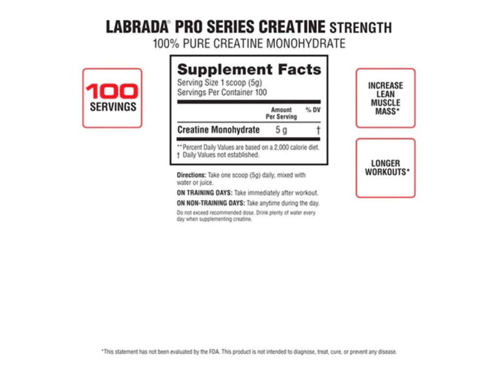 Labrada Pro Series Creatine obsahuje pouze čistý 100% kreatin monohydrát farmaceutické kvality. Výzkum ukazuje, že perorální podávání kreatinu několikrát denně zvyšuje zásoby kreatinu ve svalech, což vede k nárůstu svalové hmoty.
