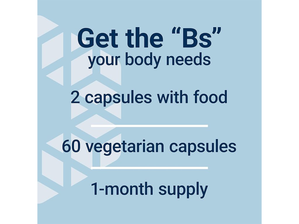 Vaše tělo potřebuje vitaminy skupiny B, aby pomohlo uvolnit energii z přijímaných potravin, jako jsou sacharidy, tuky a bílkoviny. Jinými slovy, vitaminy skupiny B pomáhají optimalizovat přeměnu potravin na energii ve vašem organismu. BioActive Complete B-Complex obsahuje vysoce účinnou směs různých typů vitaminu B, která vám zajistí všechny výhody, které může vitamín B vašemu tělu poskytnout. Poskytuje vysokou účinnost v dávkách, které jsou vědecky prozkoumané a obsahují bioaktivní formy všech živin obsažených v BioActive Complete B-Complex, což v konečném důsledku může pomoci potlačit nedostatek vitaminu B a poskytnout vám jedinečný produktUpozornění