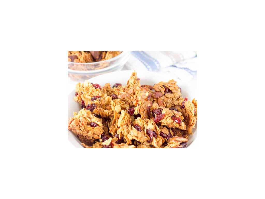 Složení: 60 % bezlepkové ovesné vločky, 19 % med, 5 % lískové ořechy, 5 % mandle natural, 5 % sušené brusinky bez přidaného cukru, 5 % kokosové chipsy, 1 % skořice/škořice.