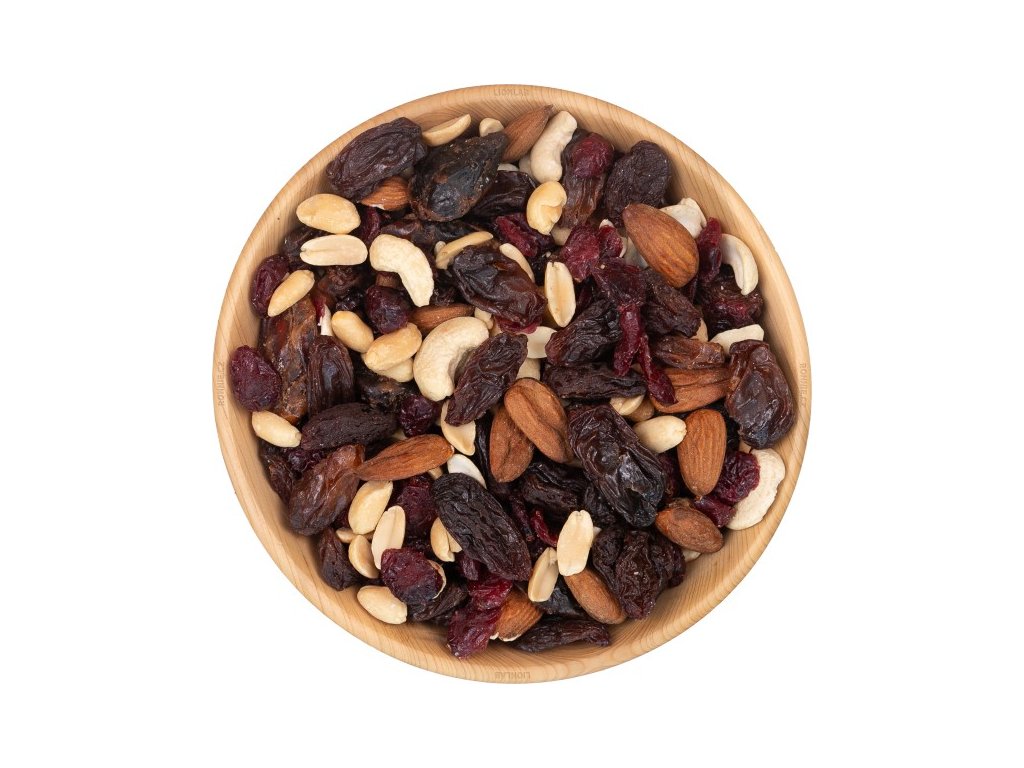Směs ovoce (rozinky, klikva/brusinka, datle), kešu, mandlí a arašídů.