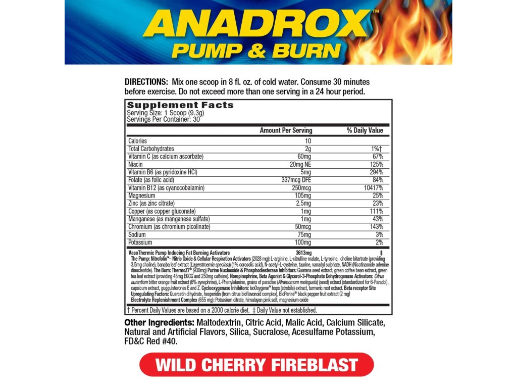 Anadrox Pump & Burn Pre-Workout kombinuje sílu oxidu dusnatého se silnými energizéry, látkami zvyšujícími výkonnost a vazotermickými katalyzátory spalování tuků v jedné průlomové formuli. Současné zvýšení oxidu dusnatého a termogeneze způsobuje rychlé zvýšení tepla, což zvyšuje váš metabolismus a spalování kalorií pro zvýšení odbourávání tukůTento pokročilý předtréninkový doplněk je navržen tak, aby podpořil váš trénink, zvýšil svalovou sílu a vytrvalost a zároveň zažehl extrémní napumpování a spalování tuků. Pokud jste sportovec zaměřený na výsledky, ANADROX Pump & Burn vám pomůže těchto výsledků dosáhnout. Pociťte pumpu a spalte palivo!