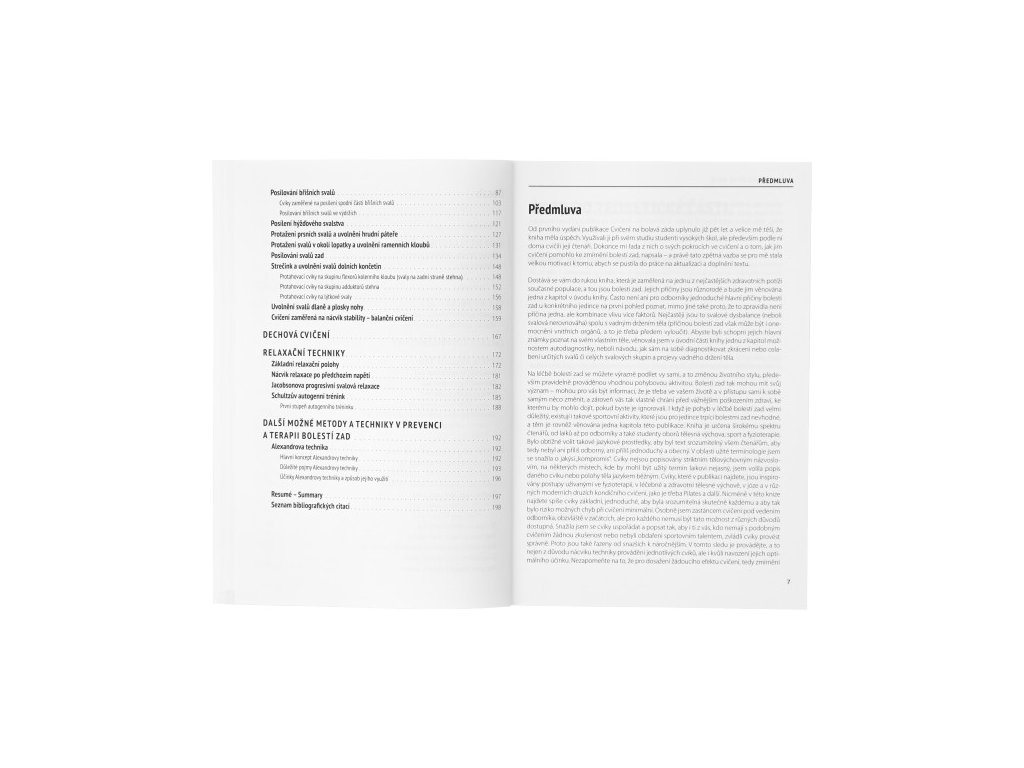 Hlavní část knihy tvoří zásobník více než 150 cviků s přesným popisem jejich účinku a provedení. Cviky jsou rozděleny podle účinku na protahovací, posilovací, uvolňovací a balanční, a rovněž podle úseků páteře a svalových skupin, na které jsou zaměřeny. Jsou popsána i dechová a relaxační cvičení.